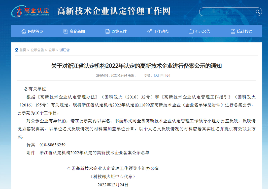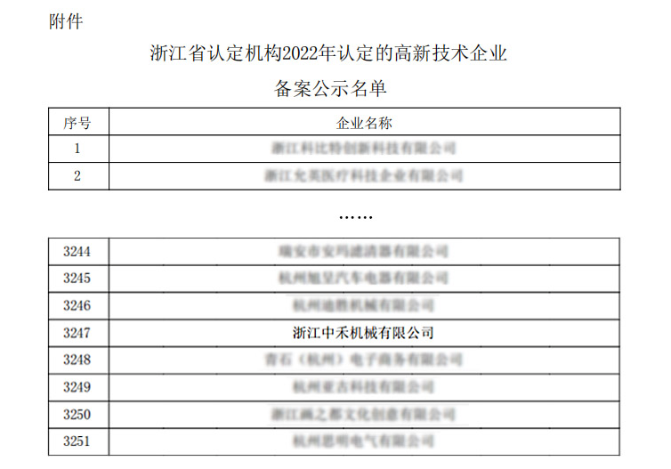2022年12月24日,全國(guó)高新技術(shù)企業(yè)認(rèn)定管理工作領(lǐng)導(dǎo)小組辦公室發(fā)布了《關(guān)于對(duì)浙江省認(rèn)定機(jī)構(gòu)2022年認(rèn)定的高新技術(shù)企業(yè)進(jìn)行備案公示的通知》,浙江中禾機(jī)械有限公司榮獲“國(guó)家高新技術(shù)企業(yè)”稱號(hào)。